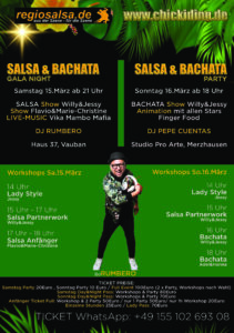 Während die Workshops jeweils im Studio Pro Arte in Merzhausen stattfinden, wird die erste Party am Samstag, 15. März ab 21 Uhr im Haus 37 im Vauban sein, die zweite am Sonntag, 16. März bereits ab 18 Uhr (bis 21.30 Uhr) im Studio Pro Arte, Merzhausen.