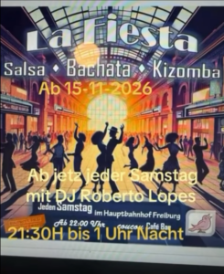 Achtung, NEU: Die La Fiesta im Freiburger Hauptbahnhof beim coucou findet ab sofort jeden Samstag – sofern an dem Abend möglich – bereits ab 21.30 Uhr (bis kurz vor 1 Uhr) statt und wird von DJ Roberto Lopes gestaltet. Die korrigierten Zeiten finden sich auf dem Flyer – das Jahr ist allerdings falsch angegeben und muss natürlich 2025 heißen.